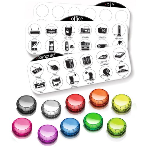 This innovative product helps identify, simplify and organize the tangled mess of cords and cables for computers, office equipment and other electronic devices. Includes 10 reusable multi-colored identifiers, 24 ready-to-go punch out icons with illustrations of common computer/office electronic devices and 12 blank do-it-yourself punch out icons. Simply punch out the appropriate icon, press it into the identifier and snap it around the cord or cable.